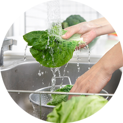 手や口腔内の除菌、食材の洗浄、調理器具の除菌、床等の除菌、トイレの除菌など、